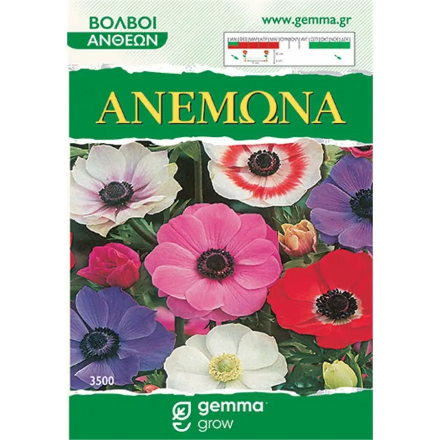 Βολβώδες φυτό φθινοπωρινής φύτευσης. Κάθε συσκευασία περιέχει 5 τεμάχια με ανεμώνες διαφόρων χρωμάτων. Την ανεμώνη, τη θαυμάζουμε ως άγριο λουλούδι στην εξοχή στα τέλη του χειμώνα και συχνά το συναντάμε φυτεμένο σε κήπους και γλάστρες. Υπάρχουν πολλές ποικιλίες ανεμώνης σε διάφορα σχήματα, μεγέθη και χρώματα.