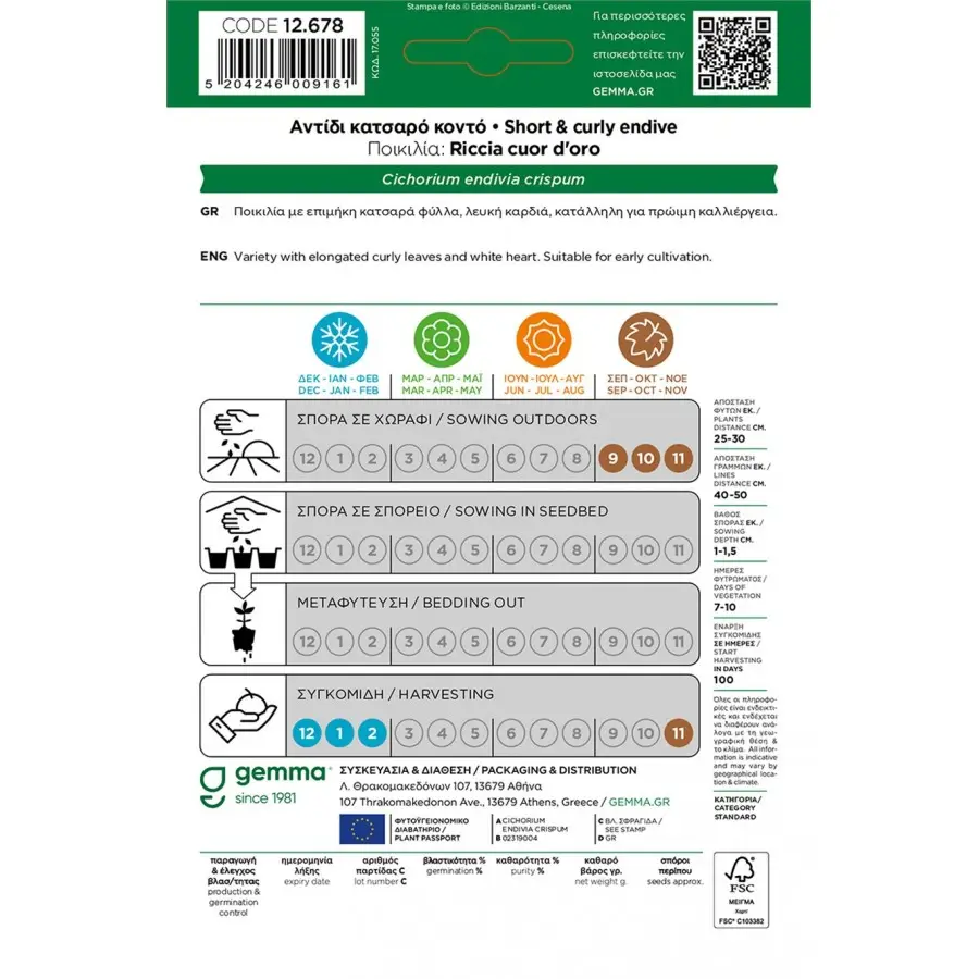 Τραγανό. Μονοετές. Ποικιλία με επιμήκη κατσαρά φύλλα, λευκή καρδιά, κατάλληλη για πρώιμη καλλιέργεια. Απόσταση φυτών (εκ.): 25-30. Απόσταση γραμμών (εκ.): 40-50. Βάθος σποράς (εκ.):1-1,5. Ημέρες φυτρώματος: 7-10. Έναρξη συγκομιδής (ημέρες): 100. Ποικιλία: Riccia cuor d’oro. 2531