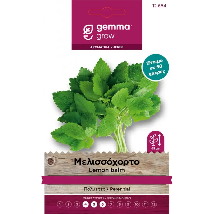 Έτοιμο σε 50 ημέρες. Πολυετές. Φύλλα οβάλ με άρωμα λεμονιού, άνθη μικρά λευκά, χρησιμοποιούνται στη μαγειρική, στην ιατρική και στην βιομηχανία αρωμάτων-ποτών. Απόσταση φυτών (εκ.): 25-30. Απόσταση γραμμών (εκ.): 50-55. Βάθος σποράς (εκ.):0,5. Ημέρες φυτρώματος: 15. Έναρξη συγκομιδής (ημέρες): 50. Melissa officinalis. 0185